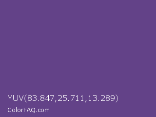 YUV 83.847,25.711,13.289 Color is a normal violet color and the nearest color is Cyber Grape #58427c. Hex code #634288 and RGB value is rgb(99,66,136). In RGB color space, this color is composed of 39% red, 26% green, 53% blue, In CMYK color space, this color is composed of 27% cyan, 51% magenta, 0% yellow , 47% black , In HSL color space, this color has a hue angle of 268° , 35% saturation and 40% lightness.