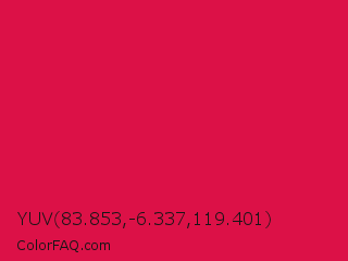 YUV 83.853,-6.337,119.401 Color is a normal rose color and the nearest color is Crimson #dc143c. Hex code #dc1147 and RGB value is rgb(220,17,71). In RGB color space, this color is composed of 86% red, 7% green, 28% blue, In CMYK color space, this color is composed of 0% cyan, 92% magenta, 68% yellow , 14% black , In HSL color space, this color has a hue angle of 344° , 86% saturation and 46% lightness.