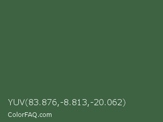 YUV 83.876,-8.813,-20.062 Color is a normal green color and the nearest color is Killarney #3a6a47. Hex code #3d6342 and RGB value is rgb(61,99,66). In RGB color space, this color is composed of 24% red, 39% green, 26% blue, In CMYK color space, this color is composed of 38% cyan, 0% magenta, 33% yellow , 61% black , In HSL color space, this color has a hue angle of 128° , 24% saturation and 31% lightness.