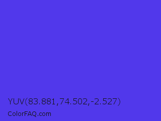 YUV 83.881,74.502,-2.527 Color is a normal indigo color and the nearest color is Majorelle Blue #6050dc. Hex code #5138eb and RGB value is rgb(81,56,235). In RGB color space, this color is composed of 32% red, 22% green, 92% blue, In CMYK color space, this color is composed of 66% cyan, 76% magenta, 0% yellow , 8% black , In HSL color space, this color has a hue angle of 248° , 82% saturation and 57% lightness.