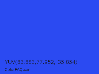 YUV 83.883,77.952,-35.854 Color is a normal blue color and the nearest color is Palatinate Blue #273be2. Hex code #2b4af2 and RGB value is rgb(43,74,242). In RGB color space, this color is composed of 17% red, 29% green, 95% blue, In CMYK color space, this color is composed of 82% cyan, 69% magenta, 0% yellow , 5% black , In HSL color space, this color has a hue angle of 231° , 88% saturation and 56% lightness.