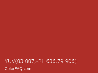 YUV 83.887,-21.636,79.906 Color is a normal red color and the nearest color is Tall Poppy #b32d29. Hex code #af2e28 and RGB value is rgb(175,46,40). In RGB color space, this color is composed of 69% red, 18% green, 16% blue, In CMYK color space, this color is composed of 0% cyan, 74% magenta, 77% yellow , 31% black , In HSL color space, this color has a hue angle of 3° , 63% saturation and 42% lightness.