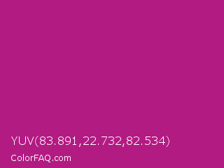YUV 83.891,22.732,82.534 Color is a normal magenta color and the nearest color is Red Violet #c71585. Hex code #b21b82 and RGB value is rgb(178,27,130). In RGB color space, this color is composed of 70% red, 11% green, 51% blue, In CMYK color space, this color is composed of 0% cyan, 85% magenta, 27% yellow , 30% black , In HSL color space, this color has a hue angle of 319° , 74% saturation and 40% lightness.