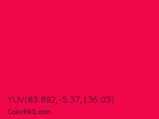 YUV 83.892,-5.37,136.03 Color is a normal rose color and the nearest color is Red Ribbon #ed0a3f. Hex code #ef0749 and RGB value is rgb(239,7,73). In RGB color space, this color is composed of 94% red, 3% green, 29% blue, In CMYK color space, this color is composed of 0% cyan, 97% magenta, 69% yellow , 6% black , In HSL color space, this color has a hue angle of 343° , 94% saturation and 48% lightness.