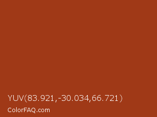 YUV 83.921,-30.034,66.721 Color is a normal color and the nearest color is Cognac #9f381d. Hex code #a03917 and RGB value is rgb(160,57,23). In RGB color space, this color is composed of 63% red, 22% green, 9% blue, In CMYK color space, this color is composed of 0% cyan, 64% magenta, 86% yellow , 37% black , In HSL color space, this color has a hue angle of 15° , 75% saturation and 36% lightness.