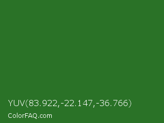 YUV 83.922,-22.147,-36.766 Color is a dark green color and the nearest color is Mughal Green #306030. Hex code #2a7227 and RGB value is rgb(42,114,39). In RGB color space, this color is composed of 16% red, 45% green, 15% blue, In CMYK color space, this color is composed of 63% cyan, 0% magenta, 66% yellow , 55% black , In HSL color space, this color has a hue angle of 118° , 49% saturation and 30% lightness.