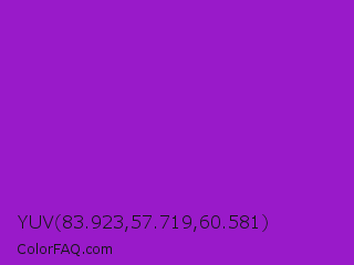 YUV 83.923,57.719,60.581 Color is a normal purple color and the nearest color is Dark Orchid #9932cc. Hex code #991ac9 and RGB value is rgb(153,26,201). In RGB color space, this color is composed of 60% red, 10% green, 79% blue, In CMYK color space, this color is composed of 24% cyan, 87% magenta, 0% yellow , 21% black , In HSL color space, this color has a hue angle of 284° , 77% saturation and 45% lightness.