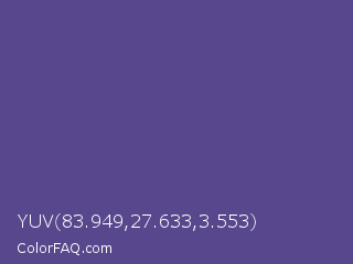 YUV 83.949,27.633,3.553 Color is a normal indigo color and the nearest color is Victoria #534491. Hex code #58478c and RGB value is rgb(88,71,140). In RGB color space, this color is composed of 35% red, 28% green, 55% blue, In CMYK color space, this color is composed of 37% cyan, 49% magenta, 0% yellow , 45% black , In HSL color space, this color has a hue angle of 255° , 33% saturation and 41% lightness.