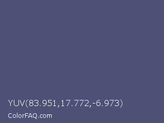 YUV 83.951,17.772,-6.973 Color is a normal blue color and the nearest color is Purple Navy #4e5180. Hex code #4c5178 and RGB value is rgb(76,81,120). In RGB color space, this color is composed of 30% red, 32% green, 47% blue, In CMYK color space, this color is composed of 37% cyan, 33% magenta, 0% yellow , 53% black , In HSL color space, this color has a hue angle of 233° , 22% saturation and 38% lightness.