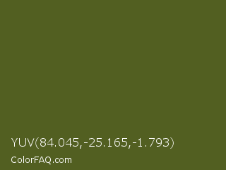 YUV 84.045,-25.165,-1.793 Color is a dark lime color and the nearest color is Dark Moss Green #4a5d23. Hex code #525f21 and RGB value is rgb(82,95,33). In RGB color space, this color is composed of 32% red, 37% green, 13% blue, In CMYK color space, this color is composed of 14% cyan, 0% magenta, 65% yellow , 63% black , In HSL color space, this color has a hue angle of 73° , 48% saturation and 25% lightness.