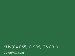 YUV 84.065,-8.906,-36.891 Color is a dark green color and the nearest color is Killarney #3a6a47. Hex code #2a6d42 and RGB value is rgb(42,109,66). In RGB color space, this color is composed of 16% red, 43% green, 26% blue, In CMYK color space, this color is composed of 61% cyan, 0% magenta, 39% yellow , 57% black , In HSL color space, this color has a hue angle of 141° , 44% saturation and 30% lightness.