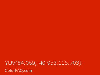 YUV 84.069,-40.953,115.703 Color is a normal red color and the nearest color is Maximum Red #d92121. Hex code #d82101 and RGB value is rgb(216,33,1). In RGB color space, this color is composed of 85% red, 13% green, 0% blue, In CMYK color space, this color is composed of 0% cyan, 85% magenta, 100% yellow , 15% black , In HSL color space, this color has a hue angle of 9° , 99% saturation and 43% lightness.