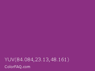 YUV 84.084,23.13,48.161 Color is a normal magenta color and the nearest color is Razzmic Berry Crayola #843179. Hex code #8b2f83 and RGB value is rgb(139,47,131). In RGB color space, this color is composed of 55% red, 18% green, 51% blue, In CMYK color space, this color is composed of 0% cyan, 66% magenta, 6% yellow , 45% black , In HSL color space, this color has a hue angle of 305° , 49% saturation and 36% lightness.