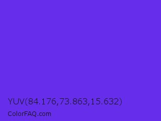 YUV 84.176,73.863,15.632 Color is a normal indigo color and the nearest color is Han Purple #5218fa. Hex code #662eea and RGB value is rgb(102,46,234). In RGB color space, this color is composed of 40% red, 18% green, 92% blue, In CMYK color space, this color is composed of 56% cyan, 80% magenta, 0% yellow , 8% black , In HSL color space, this color has a hue angle of 258° , 82% saturation and 55% lightness.