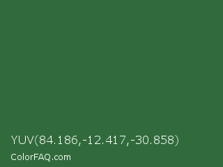 YUV 84.186,-12.417,-30.858 Color is a normal green color and the nearest color is Hunter Green #355e3b. Hex code #316b3b and RGB value is rgb(49,107,59). In RGB color space, this color is composed of 19% red, 42% green, 23% blue, In CMYK color space, this color is composed of 54% cyan, 0% magenta, 45% yellow , 58% black , In HSL color space, this color has a hue angle of 130° , 37% saturation and 31% lightness.