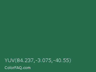 YUV 84.237,-3.075,-40.55 Color is a dark green color and the nearest color is Dark Spring Green #177245. Hex code #266d4e and RGB value is rgb(38,109,78). In RGB color space, this color is composed of 15% red, 43% green, 31% blue, In CMYK color space, this color is composed of 65% cyan, 0% magenta, 28% yellow , 57% black , In HSL color space, this color has a hue angle of 154° , 48% saturation and 29% lightness.