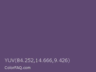 YUV 84.252,14.666,9.426 Color is a normal purple color and the nearest color is Cyber Grape #58427c. Hex code #5f4972 and RGB value is rgb(95,73,114). In RGB color space, this color is composed of 37% red, 29% green, 45% blue, In CMYK color space, this color is composed of 17% cyan, 36% magenta, 0% yellow , 55% black , In HSL color space, this color has a hue angle of 272° , 22% saturation and 37% lightness.