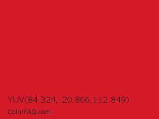 YUV 84.324,-20.866,112.849 Color is a normal red color and the nearest color is Amaranth Red #d3212d. Hex code #d51b2a and RGB value is rgb(213,27,42). In RGB color space, this color is composed of 84% red, 11% green, 16% blue, In CMYK color space, this color is composed of 0% cyan, 87% magenta, 80% yellow , 16% black , In HSL color space, this color has a hue angle of 355° , 78% saturation and 47% lightness.