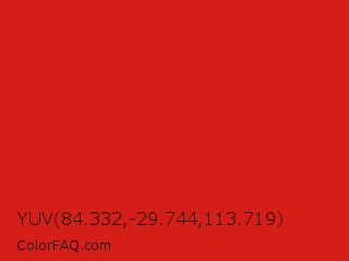 YUV 84.332,-29.744,113.719 Color is a normal red color and the nearest color is Maximum Red #d92121. Hex code #d61e18 and RGB value is rgb(214,30,24). In RGB color space, this color is composed of 84% red, 12% green, 9% blue, In CMYK color space, this color is composed of 0% cyan, 86% magenta, 89% yellow , 16% black , In HSL color space, this color has a hue angle of 2° , 80% saturation and 47% lightness.