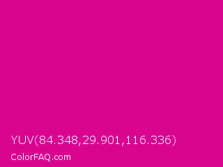 YUV 84.348,29.901,116.336 Color is a normal magenta color and the nearest color is Mexican Pink #e4007c. Hex code #d90591 and RGB value is rgb(217,5,145). In RGB color space, this color is composed of 85% red, 2% green, 57% blue, In CMYK color space, this color is composed of 0% cyan, 98% magenta, 33% yellow , 15% black , In HSL color space, this color has a hue angle of 320° , 95% saturation and 44% lightness.