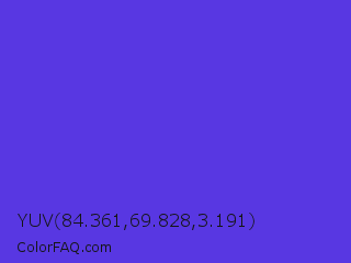 YUV 84.361,69.828,3.191 Color is a normal indigo color and the nearest color is Majorelle Blue #6050dc. Hex code #5837e2 and RGB value is rgb(88,55,226). In RGB color space, this color is composed of 35% red, 22% green, 89% blue, In CMYK color space, this color is composed of 61% cyan, 76% magenta, 0% yellow , 11% black , In HSL color space, this color has a hue angle of 252° , 75% saturation and 55% lightness.
