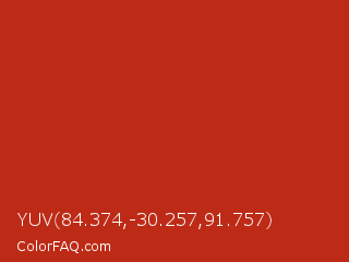 YUV 84.374,-30.257,91.757 Color is a normal red color and the nearest color is Thunderbird #c02b18. Hex code #bd2b17 and RGB value is rgb(189,43,23). In RGB color space, this color is composed of 74% red, 17% green, 9% blue, In CMYK color space, this color is composed of 0% cyan, 77% magenta, 88% yellow , 26% black , In HSL color space, this color has a hue angle of 7° , 78% saturation and 42% lightness.