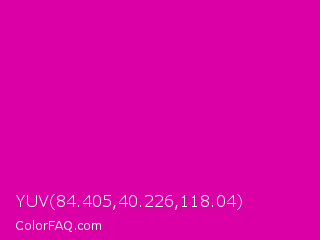 YUV 84.405,40.226,118.04 Color is a normal magenta color and the nearest color is Hollywood Cerise #f400a1. Hex code #db00a6 and RGB value is rgb(219,-0,166). In RGB color space, this color is composed of 86% red, 0% green, 65% blue, In CMYK color space, this color is composed of 0% cyan, 100% magenta, 24% yellow , 14% black , In HSL color space, this color has a hue angle of 315° , 100% saturation and 43% lightness.