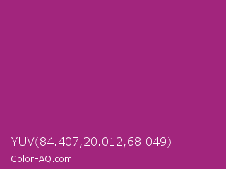 YUV 84.407,20.012,68.049 Color is a normal magenta color and the nearest color is Royal Heath #ab3472. Hex code #a2257d and RGB value is rgb(162,37,125). In RGB color space, this color is composed of 64% red, 15% green, 49% blue, In CMYK color space, this color is composed of 0% cyan, 77% magenta, 23% yellow , 36% black , In HSL color space, this color has a hue angle of 318° , 63% saturation and 39% lightness.