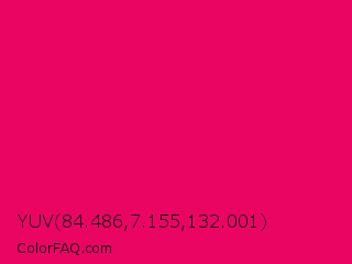 YUV 84.486,7.155,132.001 Color is a normal rose color and the nearest color is Raspberry #e30b5d. Hex code #eb0563 and RGB value is rgb(235,5,99). In RGB color space, this color is composed of 92% red, 2% green, 39% blue, In CMYK color space, this color is composed of 0% cyan, 98% magenta, 58% yellow , 8% black , In HSL color space, this color has a hue angle of 335° , 96% saturation and 47% lightness.