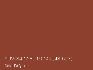 YUV 84.558,-19.502,48.623 Color is a normal red color and the nearest color is El Salva #8f3e33. Hex code #8c402d and RGB value is rgb(140,64,45). In RGB color space, this color is composed of 55% red, 25% green, 18% blue, In CMYK color space, this color is composed of 0% cyan, 54% magenta, 68% yellow , 45% black , In HSL color space, this color has a hue angle of 12° , 51% saturation and 36% lightness.