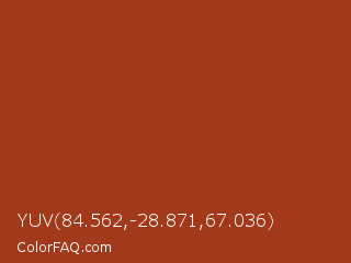 YUV 84.562,-28.871,67.036 Color is a normal red color and the nearest color is Cognac #9f381d. Hex code #a1391a and RGB value is rgb(161,57,26). In RGB color space, this color is composed of 63% red, 22% green, 10% blue, In CMYK color space, this color is composed of 0% cyan, 65% magenta, 84% yellow , 37% black , In HSL color space, this color has a hue angle of 14° , 72% saturation and 37% lightness.