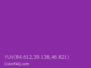 YUV 84.612,39.138,46.821 Color is a normal purple color and the nearest color is Vivid Violet #803790. Hex code #8a2aa4 and RGB value is rgb(138,42,164). In RGB color space, this color is composed of 54% red, 16% green, 64% blue, In CMYK color space, this color is composed of 16% cyan, 74% magenta, 0% yellow , 36% black , In HSL color space, this color has a hue angle of 287° , 59% saturation and 40% lightness.