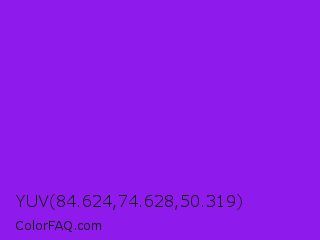 YUV 84.624,74.628,50.319 Color is a normal purple color and the nearest color is Veronica #a020f0. Hex code #8e1aec and RGB value is rgb(142,26,236). In RGB color space, this color is composed of 56% red, 10% green, 93% blue, In CMYK color space, this color is composed of 40% cyan, 89% magenta, 0% yellow , 7% black , In HSL color space, this color has a hue angle of 273° , 85% saturation and 51% lightness.