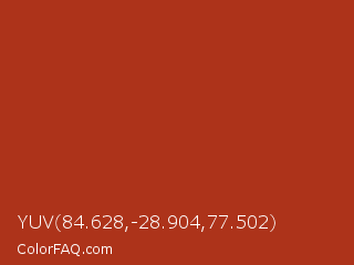 YUV 84.628,-28.904,77.502 Color is a normal red color and the nearest color is Chinese Red #aa381e. Hex code #ad331a and RGB value is rgb(173,51,26). In RGB color space, this color is composed of 68% red, 20% green, 10% blue, In CMYK color space, this color is composed of 0% cyan, 71% magenta, 85% yellow , 32% black , In HSL color space, this color has a hue angle of 10° , 74% saturation and 39% lightness.