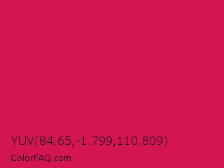 YUV 84.65,-1.799,110.809 Color is a normal rose color and the nearest color is Debian Red #d70a53. Hex code #d31551 and RGB value is rgb(211,21,81). In RGB color space, this color is composed of 83% red, 8% green, 32% blue, In CMYK color space, this color is composed of 0% cyan, 90% magenta, 62% yellow , 17% black , In HSL color space, this color has a hue angle of 341° , 82% saturation and 45% lightness.