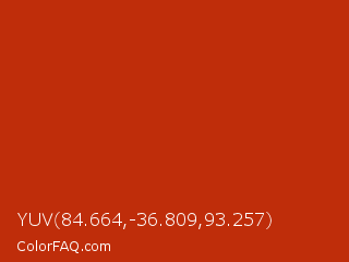 YUV 84.664,-36.809,93.257 Color is a normal red color and the nearest color is Thunderbird #c02b18. Hex code #bf2d0a and RGB value is rgb(191,45,10). In RGB color space, this color is composed of 75% red, 18% green, 4% blue, In CMYK color space, this color is composed of 0% cyan, 76% magenta, 95% yellow , 25% black , In HSL color space, this color has a hue angle of 12° , 90% saturation and 39% lightness.