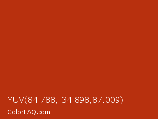 YUV 84.788,-34.898,87.009 Color is a normal red color and the nearest color is Thunderbird #c02b18. Hex code #b8300e and RGB value is rgb(184,48,14). In RGB color space, this color is composed of 72% red, 19% green, 5% blue, In CMYK color space, this color is composed of 0% cyan, 74% magenta, 92% yellow , 28% black , In HSL color space, this color has a hue angle of 12° , 86% saturation and 39% lightness.