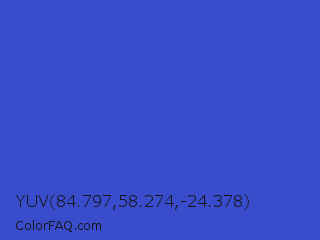 YUV 84.797,58.274,-24.378 Color is a normal blue color and the nearest color is Cerulean Blue #2a52be. Hex code #394ccb and RGB value is rgb(57,76,203). In RGB color space, this color is composed of 22% red, 30% green, 80% blue, In CMYK color space, this color is composed of 72% cyan, 63% magenta, 0% yellow , 20% black , In HSL color space, this color has a hue angle of 232° , 58% saturation and 51% lightness.