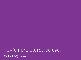 YUV 84.842,30.151,36.096 Color is a normal purple color and the nearest color is Vivid Violet #803790. Hex code #7e3492 and RGB value is rgb(126,52,146). In RGB color space, this color is composed of 49% red, 20% green, 57% blue, In CMYK color space, this color is composed of 14% cyan, 64% magenta, 0% yellow , 43% black , In HSL color space, this color has a hue angle of 287° , 47% saturation and 39% lightness.