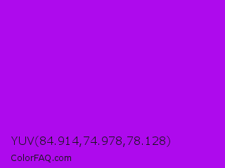 YUV 84.914,74.978,78.128 Color is a normal purple color and the nearest color is Vivid Mulberry #b80ce3. Hex code #ae0aed and RGB value is rgb(174,10,237). In RGB color space, this color is composed of 68% red, 4% green, 93% blue, In CMYK color space, this color is composed of 27% cyan, 96% magenta, 0% yellow , 7% black , In HSL color space, this color has a hue angle of 283° , 92% saturation and 48% lightness.
