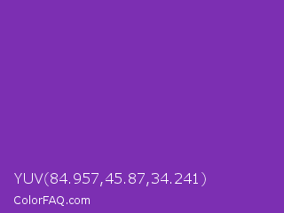 YUV 84.957,45.87,34.241 Color is a normal purple color and the nearest color is Grape #6f2da8. Hex code #7c2fb2 and RGB value is rgb(124,47,178). In RGB color space, this color is composed of 49% red, 18% green, 70% blue, In CMYK color space, this color is composed of 30% cyan, 74% magenta, 0% yellow , 30% black , In HSL color space, this color has a hue angle of 275° , 58% saturation and 44% lightness.