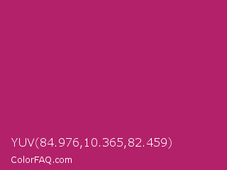 YUV 84.976,10.365,82.459 Color is a normal rose color and the nearest color is Hibiscus #b6316c. Hex code #b3216a and RGB value is rgb(179,33,106). In RGB color space, this color is composed of 70% red, 13% green, 42% blue, In CMYK color space, this color is composed of 0% cyan, 82% magenta, 41% yellow , 30% black , In HSL color space, this color has a hue angle of 330° , 69% saturation and 42% lightness.