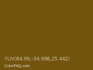 YUV 84.99,-34.998,25.442 Color is a dark orange color and the nearest color is Raw Umber #734a12. Hex code #72540e and RGB value is rgb(114,84,14). In RGB color space, this color is composed of 45% red, 33% green, 5% blue, In CMYK color space, this color is composed of 0% cyan, 26% magenta, 88% yellow , 55% black , In HSL color space, this color has a hue angle of 42° , 78% saturation and 25% lightness.