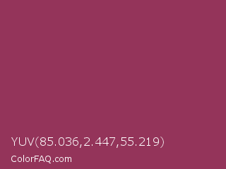 YUV 85.036,2.447,55.219 Color is a normal rose color and the nearest color is Quinacridone Magenta #8e3a59. Hex code #94345a and RGB value is rgb(148,52,90). In RGB color space, this color is composed of 58% red, 20% green, 35% blue, In CMYK color space, this color is composed of 0% cyan, 65% magenta, 39% yellow , 42% black , In HSL color space, this color has a hue angle of 336° , 48% saturation and 39% lightness.