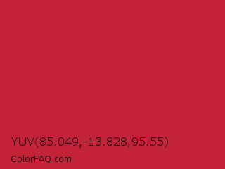 YUV 85.049,-13.828,95.55 Color is a normal red color and the nearest color is Cardinal #c41e3a. Hex code #c22339 and RGB value is rgb(194,35,57). In RGB color space, this color is composed of 76% red, 14% green, 22% blue, In CMYK color space, this color is composed of 0% cyan, 82% magenta, 71% yellow , 24% black , In HSL color space, this color has a hue angle of 352° , 69% saturation and 45% lightness.