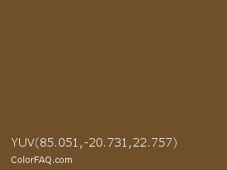 YUV 85.051,-20.731,22.757 Color is a dark orange color and the nearest color is Dallas #6e4b26. Hex code #6f502b and RGB value is rgb(111,80,43). In RGB color space, this color is composed of 44% red, 31% green, 17% blue, In CMYK color space, this color is composed of 0% cyan, 28% magenta, 61% yellow , 56% black , In HSL color space, this color has a hue angle of 33° , 44% saturation and 30% lightness.