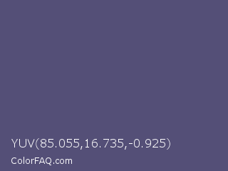 YUV 85.055,16.735,-0.925 Color is a normal indigo color and the nearest color is Purple Navy #4e5180. Hex code #544f77 and RGB value is rgb(84,79,119). In RGB color space, this color is composed of 33% red, 31% green, 47% blue, In CMYK color space, this color is composed of 29% cyan, 34% magenta, 0% yellow , 53% black , In HSL color space, this color has a hue angle of 248° , 20% saturation and 39% lightness.