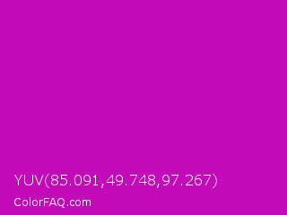 YUV 85.091,49.748,97.267 Color is a normal magenta color and the nearest color is Deep Magenta #cc00cc. Hex code #c409ba and RGB value is rgb(196,9,186). In RGB color space, this color is composed of 77% red, 4% green, 73% blue, In CMYK color space, this color is composed of 0% cyan, 95% magenta, 5% yellow , 23% black , In HSL color space, this color has a hue angle of 303° , 91% saturation and 40% lightness.