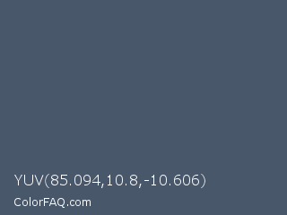YUV 85.094,10.8,-10.606 Color is a normal blue color and the nearest color is Independence #4c516d. Hex code #49576b and RGB value is rgb(73,87,107). In RGB color space, this color is composed of 29% red, 34% green, 42% blue, In CMYK color space, this color is composed of 32% cyan, 19% magenta, 0% yellow , 58% black , In HSL color space, this color has a hue angle of 215° , 19% saturation and 35% lightness.