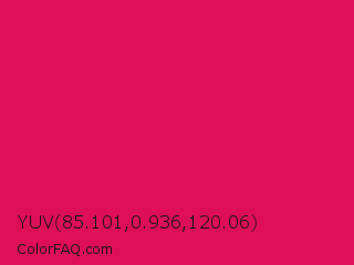 YUV 85.101,0.936,120.06 Color is a normal rose color and the nearest color is Razzmatazz Crayola #e30b5c. Hex code #de0f57 and RGB value is rgb(222,15,87). In RGB color space, this color is composed of 87% red, 6% green, 34% blue, In CMYK color space, this color is composed of 0% cyan, 93% magenta, 61% yellow , 13% black , In HSL color space, this color has a hue angle of 339° , 87% saturation and 46% lightness.